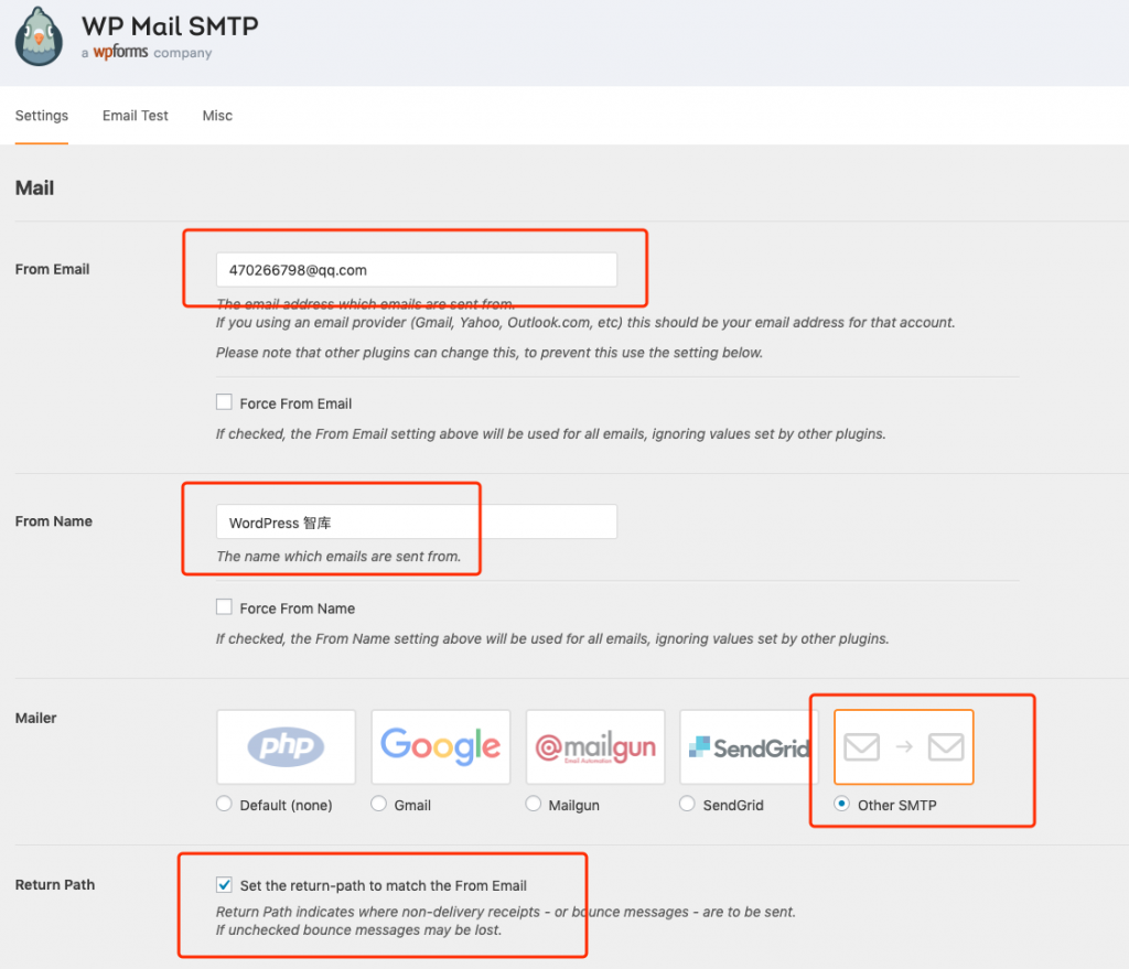 Actually, we can think of WP Mail SMTP as an email client, like Foxmail, but it runs on the server. Based on this, you can refer to the method of setting up an email client to set up the WordPress SMTP server. Since we don’t need to receive emails in WordPress, just set up the SMTP server; the POP3 server for receiving emails doesn’t need to be set up.